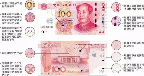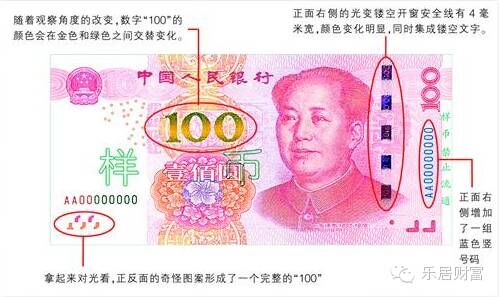 ②正面右側安全線:由品紅變綠,透光可見正反交替排列的鏤空“¥100”;